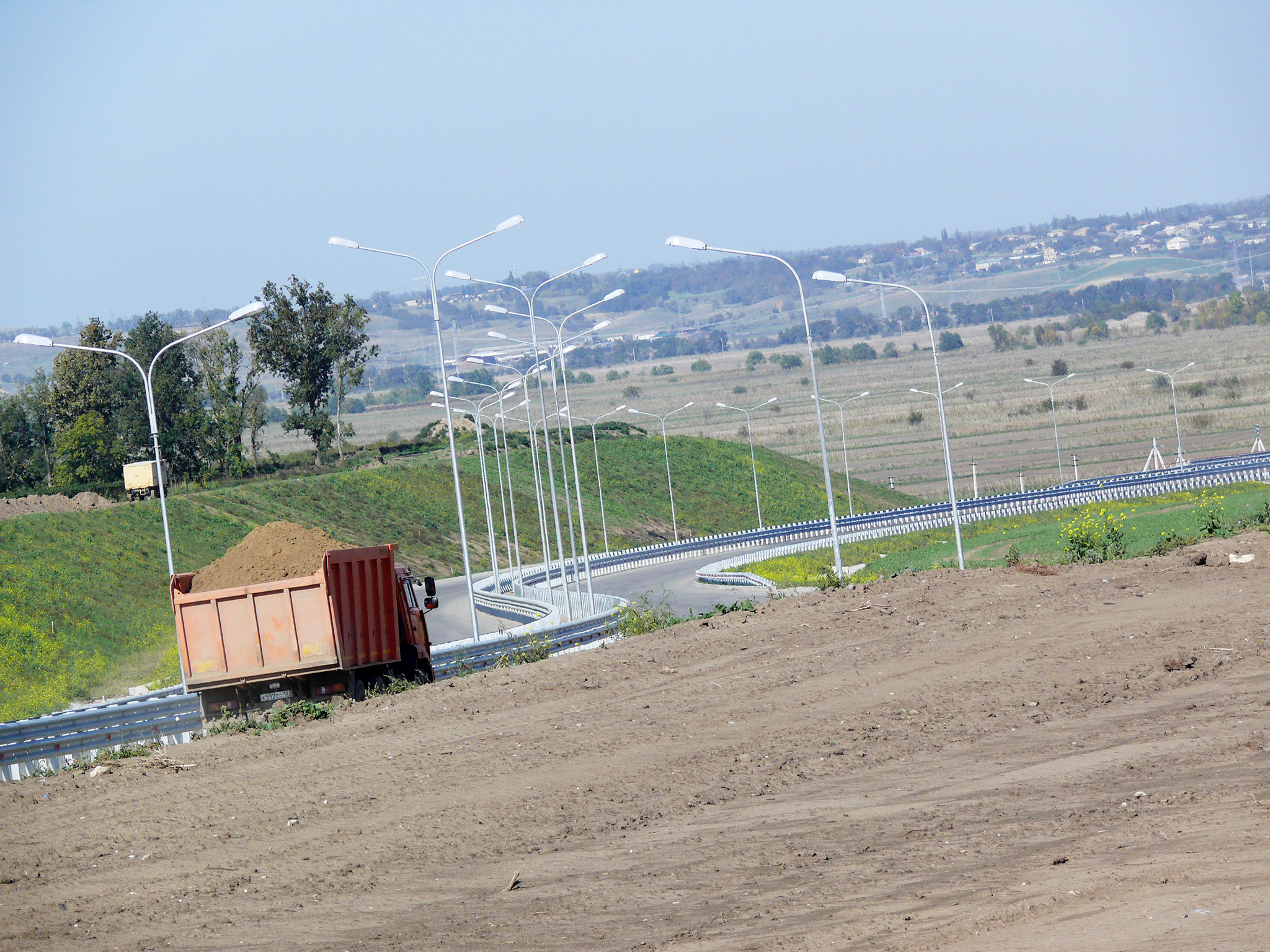 Так как у меня был большой запас по времени, я не особо рвался, и ехал в своё удовольствие, иногда останавливаясь для фотографирования (фото 195) или просто перевести дух. Заехал в хутор Белый и там перекусил "Снежком" и пирожным. Далее - спуск с горы и тянучка по трассе через Джигинку, Уташ и Виноградный. В Джигинке строят новую развязку (фото 196) - дело хорошее, но не мешало бы и всю трассу немного расширить...