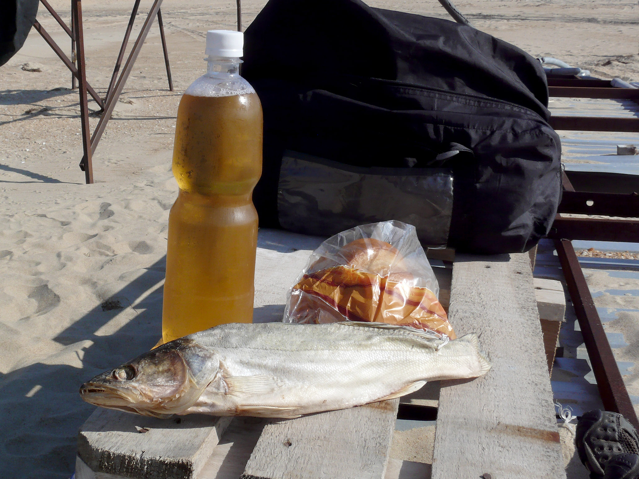 Теперь пора было подкрепиться: пиво и рыба ждали своего часа (фото 200), и я приступил к трапезе. Рыба оказалось такой большой, что съесть её всю сразу я не смог, и часть очищенных кусков оставил на завтра. Потом занялся полосканием замоченных вещей, и хотя морская вода плохо мылится, основная грязь всё-таки отстиралась. Вещи также отправились сушиться на верёвку.