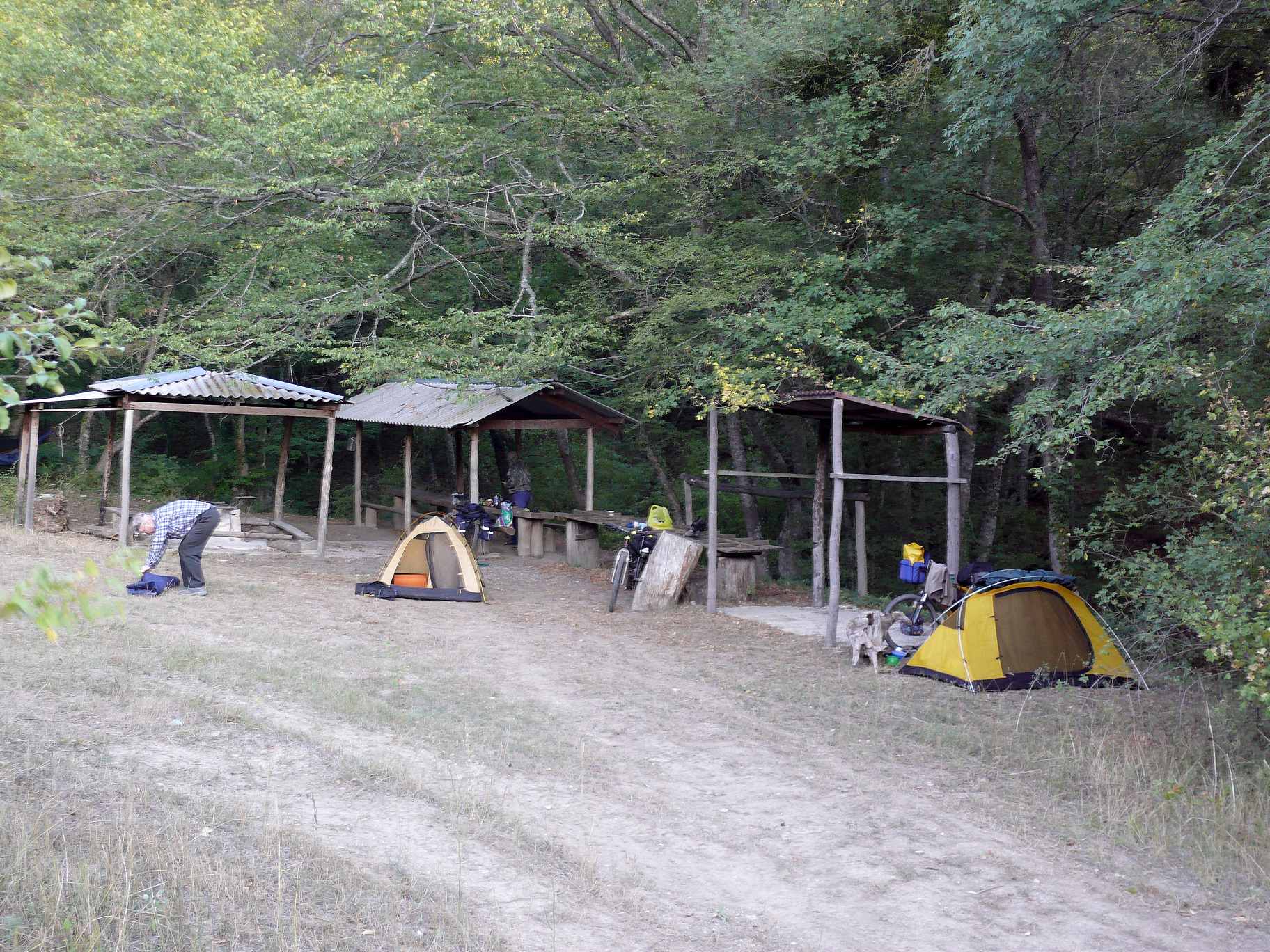 До перевала преобладал спуск, дорога шла по более открытой местности, а как известно, там, где мало деревьев, обнажаются камни. Игорь, у которого передняя вилка не имела амортизатора, тяжелее управлялся с каменистой дорогой, а Андрей, который по-прежнему ехал сзади, несмотря на наличие амортизатора, всё-таки упал: мы издалека услышали его протяжные стоны, когда уже выехали на развилку перед перевалом Маски. Поскольку непонятно было, как сильно он пострадал (уж очень громко он стонал), Игорь пошел ему навстречу, а я, чтобы не терять времени, направился на поиски родника Маскин-Чешмесы. И нашел-таки, хоть и слабенького, но с водой.