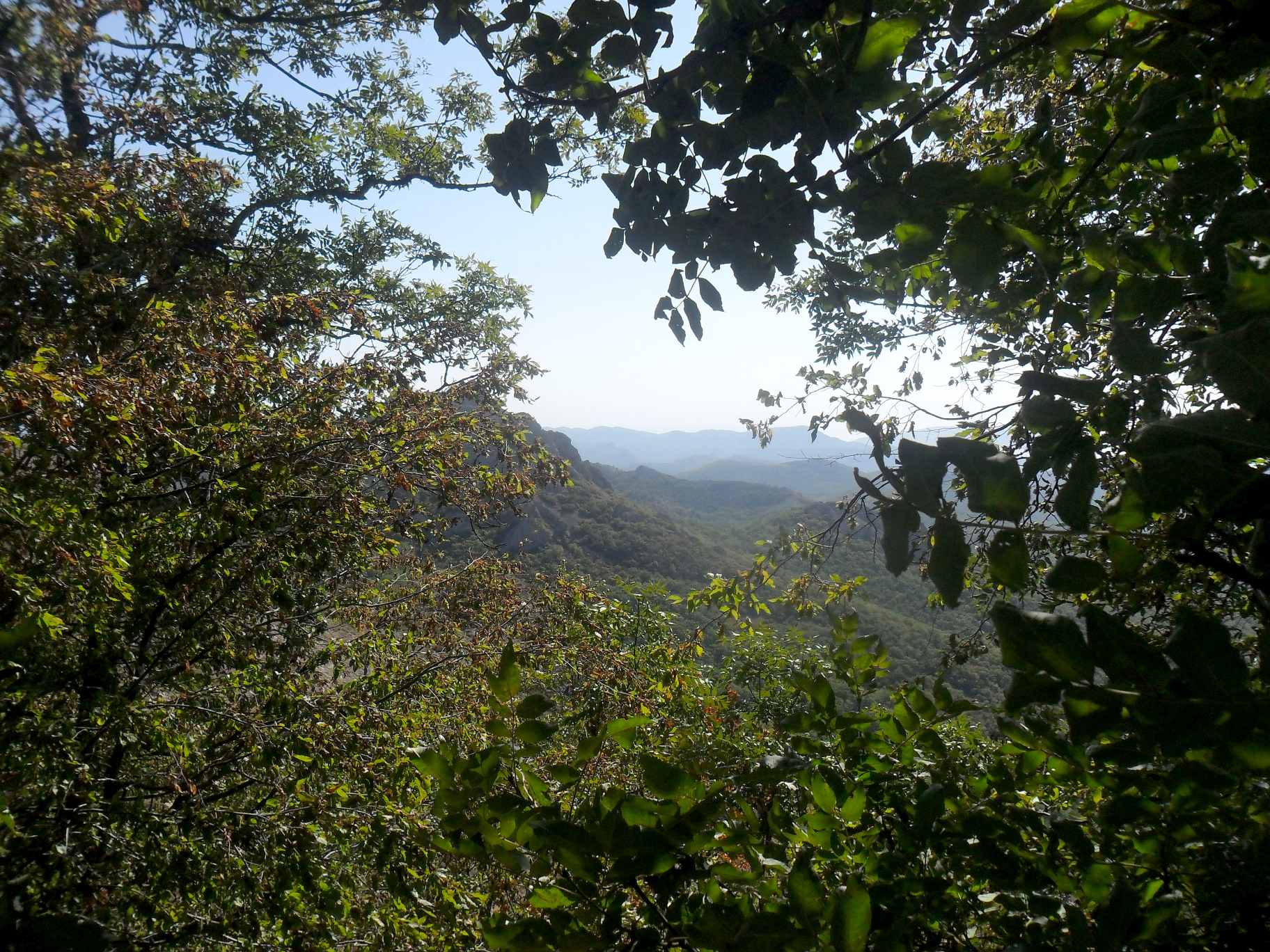 Через 3 часа мы, наконец, достигли перевала Чатал-Богаз (), после которого дорога стала более пологой - шла то вверх, то вниз. Из-за плотной растительности красивых видов не было, только в одном месте был просвет, через который можно было сфоткать Кошку () и кусочек моря (). Зато деревья хорошо защищали от жары – на небе-то ни облачка. Я предупредил Игоря, чтобы тот не вырывался вперёд и не проскочил родник, от которого зависела судьба дальнейшего маршрута.