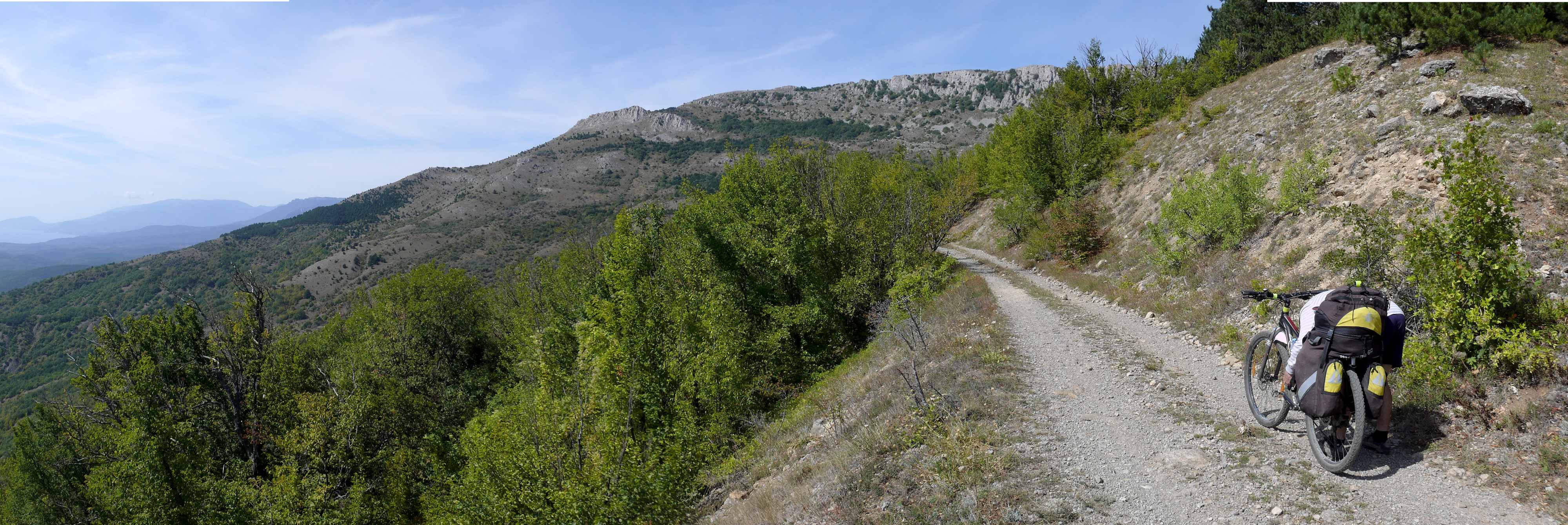 Дорога шла траверсом южного склона Караби. Вначале заехали на родник Вересь-Чокрак (). Источник исправно работал, вода чистая, холодная. Наполнили бутылки и двинулись дальше. Постепенно выкарабкались из леса, дорога немного выровнялась. Стали появляться живописные пейзажи (), но каждый раз было лень останавливаться и фотографировать (). Доехали до беседки (): здесь можно свернуть налево и доехать до побережья (), а мы, после небольшого отдыха и перекуса, продолжили движение прямо (). К сожалению, чем дальше мы продвигались, тем хуже становилась дорога (): она стала скакать то вверх, то вниз, и стала сильно каменистой (). Но деваться некуда – до Чигенитры надо доехать в любом случае ().