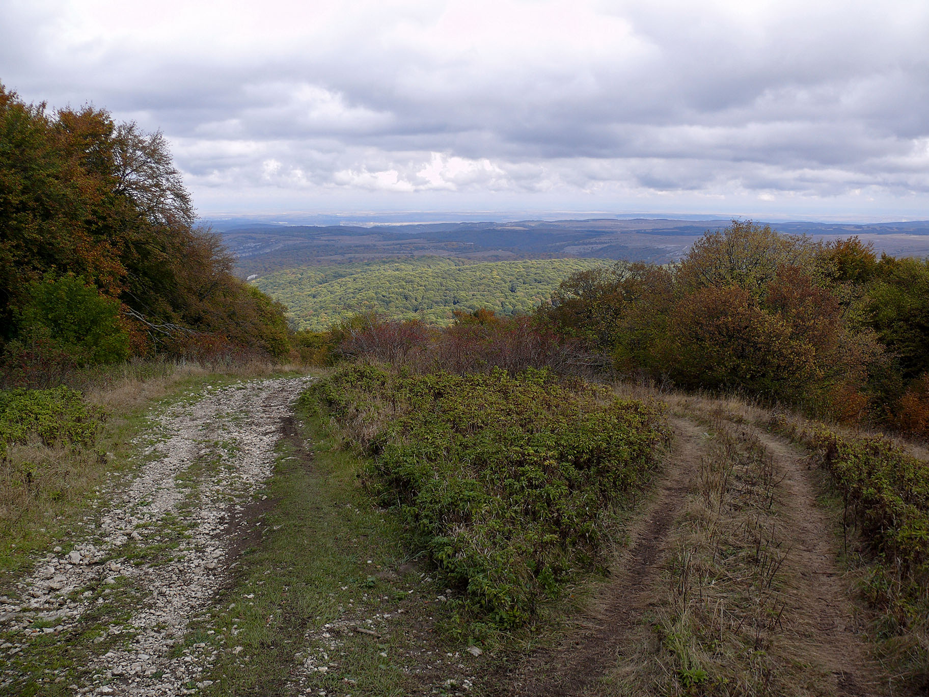 Чтобы легче было подниматься, воду набирать не стали. От корыта дорога круто запетляла меж вековых деревьев, велосипеды толкали с частыми перерывами. Всё-таки дожди, прошедшие летом, сильно подпортили грунтовые дороги: приходилось объезжать лужи и грязь, перепрыгивая через глубокие колеи. Хотя такая картина - не редкость для крымских лесов. Но по мере подъёма дорога становилась суше, а когда вышли из леса, то от раскисшей глины не осталось и следа (). Ещё немного, и выйдем на плато, к Стол-горе.