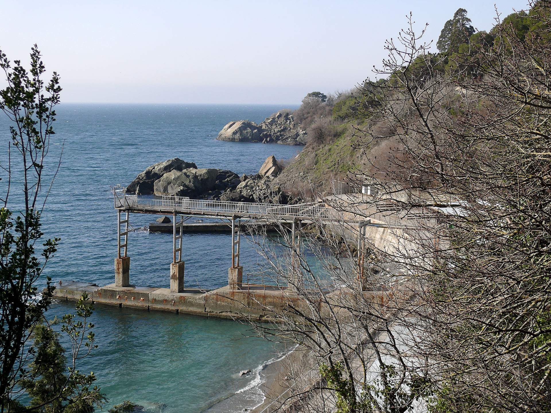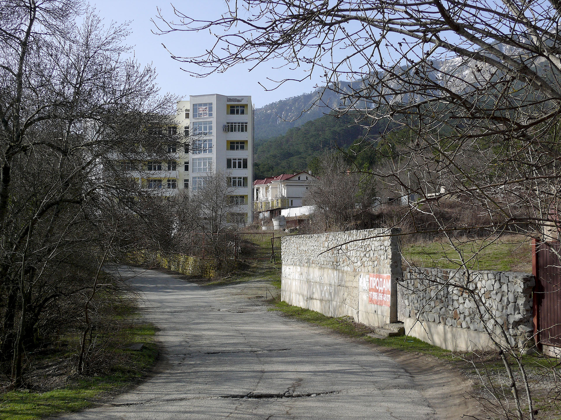 Вот ведь как выходит: осенью тут были лужи, дождь, а сейчас, в феврале, сухо и ясно! Дошёл до камня-Утюжка, но опять туда не заходил, чтобы не мешать людям (). Продолжил путь, и чтобы веселей шагалось, достал шоколадный батончик, купленный наверху. Дорожка петляла меж деревьев, скрывавших живописные пейзажи побережья (). Иногда посреди леса возникали заборы, за которыми прятались коттеджи богатых крымчан (или может быть, москвичей).