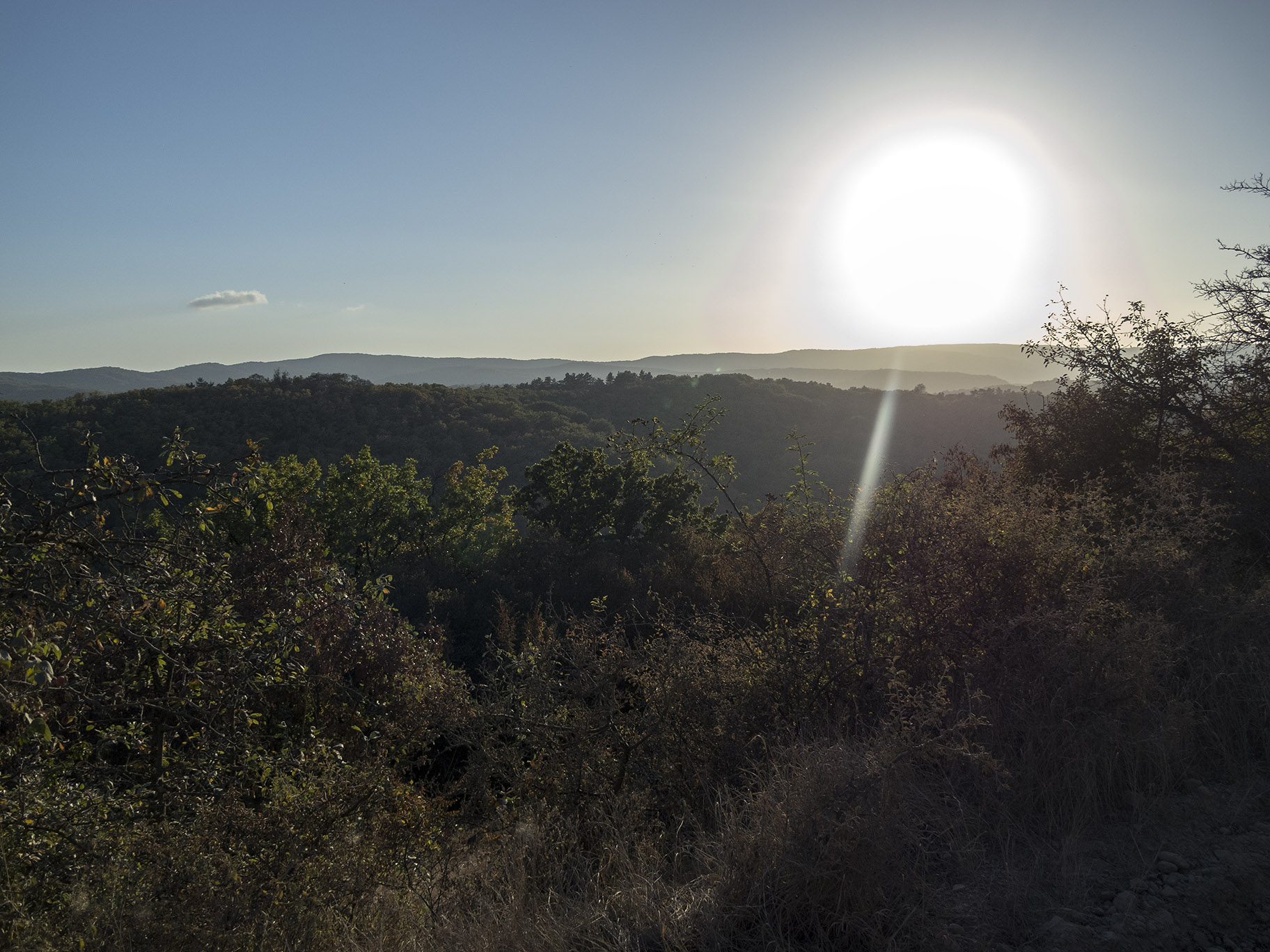 После крутого поворота дорога стала более пологой. Через километр я дошёл до тропинки, ведущей на поляну и повернул туда. Как и следовало ожидать, там никого не было. Я направился в левый край поляны, где мы ночевали в прошлом году (). Усталость, конечно, чувствовалась, но болезненных проявлений в ногах не было, и это хорошо. И, после принятия стаканчика Муската, купленного в Симферополе, не мешкая начал готовиться к ночлегу.