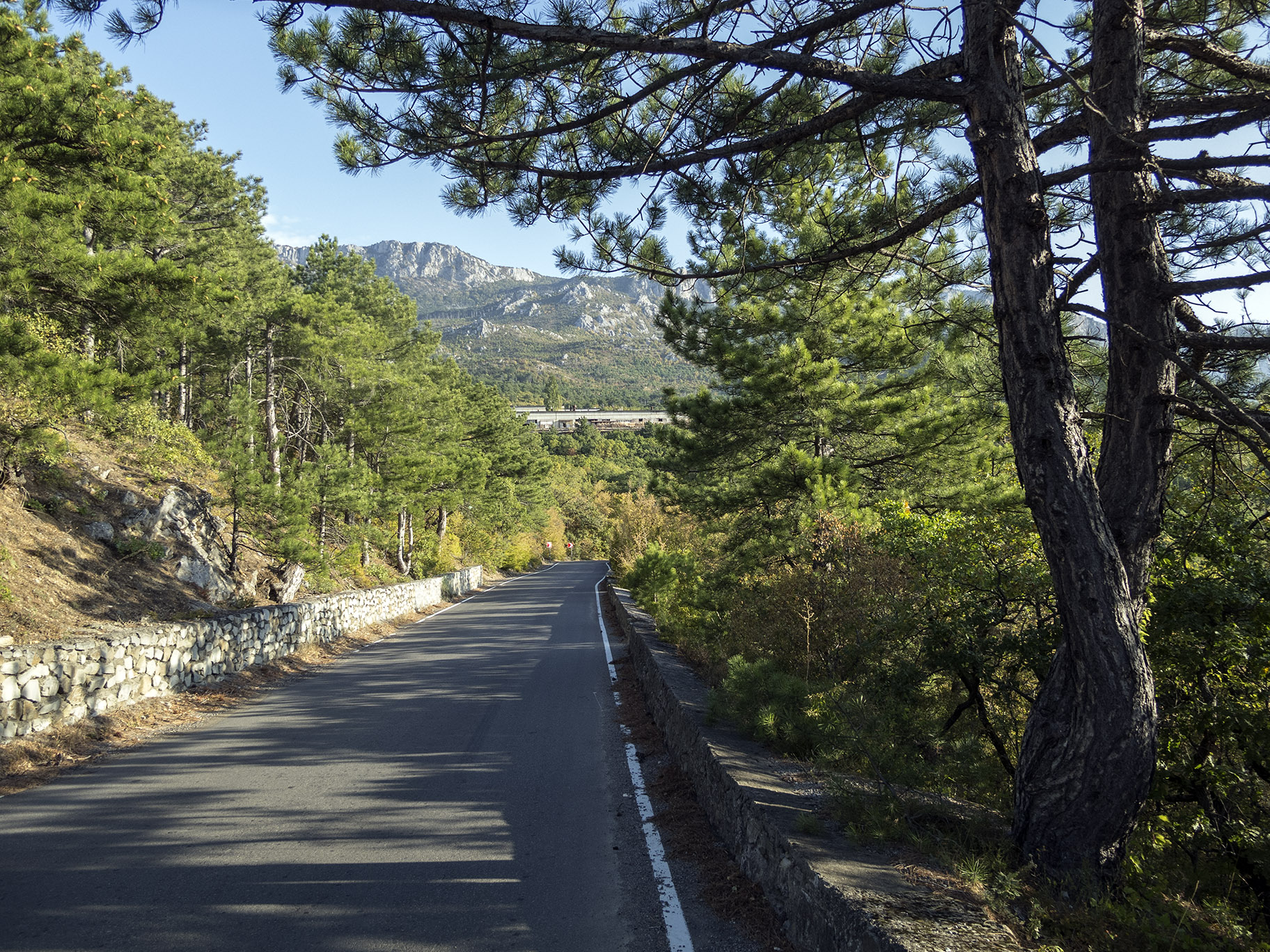 Вот дорога пошла вниз, и, сделав пару крутых серпантинов, воткнулась в шоссе, идущее в Орлиное. На самом деле это продолжение Севастопольского старого шоссе, просто участок Форос - Орлиное пользуется большей популярностью, да и машин здесь больше. Но у меня другого пути нет, кроме как на Байдарский перевал (). Здесь дорога хорошая, хотя всё время идёт в гору.