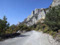Теперь шоссе окончательно вынырнуло из леса и прижалось к каменной стене (). Летом здесь было бы пекло, а сейчас очень даже комфортная обстановка, и к тому же утренняя прохлада ещё не выветрилась. Ещё пара километров, и я достиг ещё одного памятного места: с одной стороны, братская могила партизан (), а с другой - мы здесь ночевали в 1992 году, когда совершали пеший поход от Фороса в Морское (). Конечно, сейчас трудно узнать точно, где стояли наши палатки, но географически это то самое место. Отсюда, кстати, начинается тропа на Шайтан-Мердвен, по которой мы тогда спустились с Римской дороги (). А ещё в мае 2002 года я с велосипедом ПОДНЯЛСЯ по этой тропе на яйлу!
