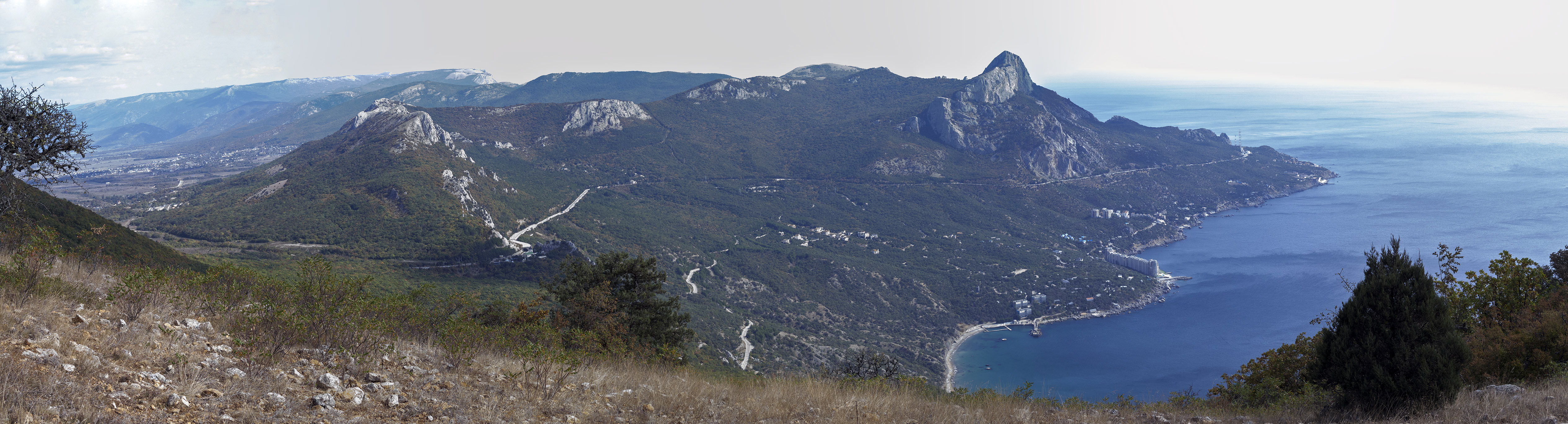 Сразу после поворота начался серьёзный крутяк по крупным камням (). Но оно того стоило: как только я выбрался на седловину, взору открылась умопомрачительная панорама бухты Ласпи (). Хорошо было видно детский лагерь Ласпи и недавно построенная гостиница «Бухта Мечты» (). А над ними - трасса Севастополь-Ялта и перевал Ласпи с галереей (). Но это ещё не сама гора Куш-Кая, до неё ещё 400 метров, если верить указателю (). направляюсь согласно стрелке.