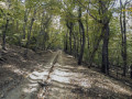 После села выехал на трассу и, проехав километр с небольшим, перешёл на другую сторону к шлагбауму, перекрывающему дорогу на хребет Кокия-Бель (). Раньше мне казалось, что из-за крутизны здесь будет трудно ехать, но это было справедливо только для первых двух десятков метров. После крутого поворота дорога пошла более пологой, что позволяло ехать (). Асфальт, хоть и ни разу не ремонтировался со времён постройки, был неплохого качества, и лишь в некоторых местах были выбоины. Дополнительным плюсом были деревья, шатром накрывающие шоссе, что создавало прохладу. И, несмотря на то что GPS снова вырубился, путь был понятен: вперёд и вверх.