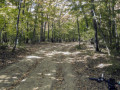 Через час после шлагбаума я доехал до развилки: прямо и в гору продолжался асфальт, а вправо уходила грунтовая колея (). Мой трек показывал, что надо ехать направо, ведь я планировал проехать весь хребет Биллер - до бывшего ракетного комплекса «Утёс», чтобы потом спуститься через село Резервное на трассу. Повернул. Дорога почти горизонтальная, но надо было внимательно смотреть под колёса: то камень подвернётся, то ветки (). Навигатор, поработав несколько минут, опять ушёл в аут, но и тут дорога была очевидна: слева - гора Кокия-Бель, справа - крутой склон.