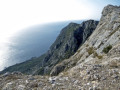 Ещё один небольшой торчок - и вот знакомые развалины (). Что здесь было раньше - точно не известно, но место угрюмое, и я поднимаюсь ещё выше - на площадку перед обрывом () - отсюда видна не только бухта, но и Батилиман, если подойти к краю (). Из-за сильного ветра не решаюсь встать на край, лучше присесть на камешек ().