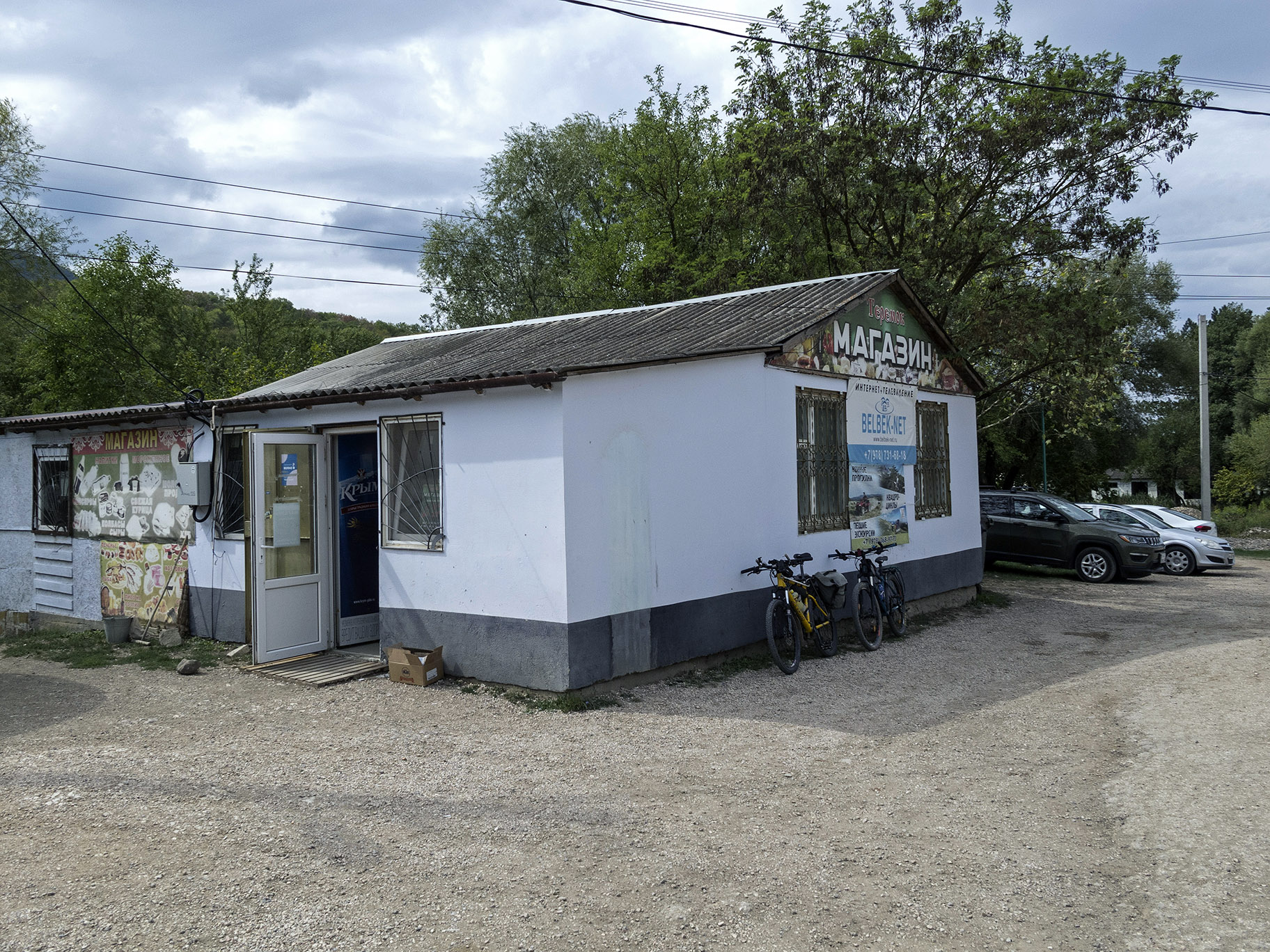 Ассортимент местного магазина меня не устраивал ещё в прошлой поездке, а питаться надо было чем-то... Поэтому после посещения кафе и знакомства с хозяйкой решено было поехать в соседнее село Счастливое - там целых два магазина, и товаров гораздо больше. Я накупил продуктов на целую неделю, что увеличило объём моих багажных сумок почти до предела, и, посетив напоследок второй магазин () (там удалось купить огурцов и развесных пельменей), с чувством выполненного долга мы отправились восвояси.