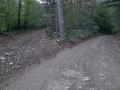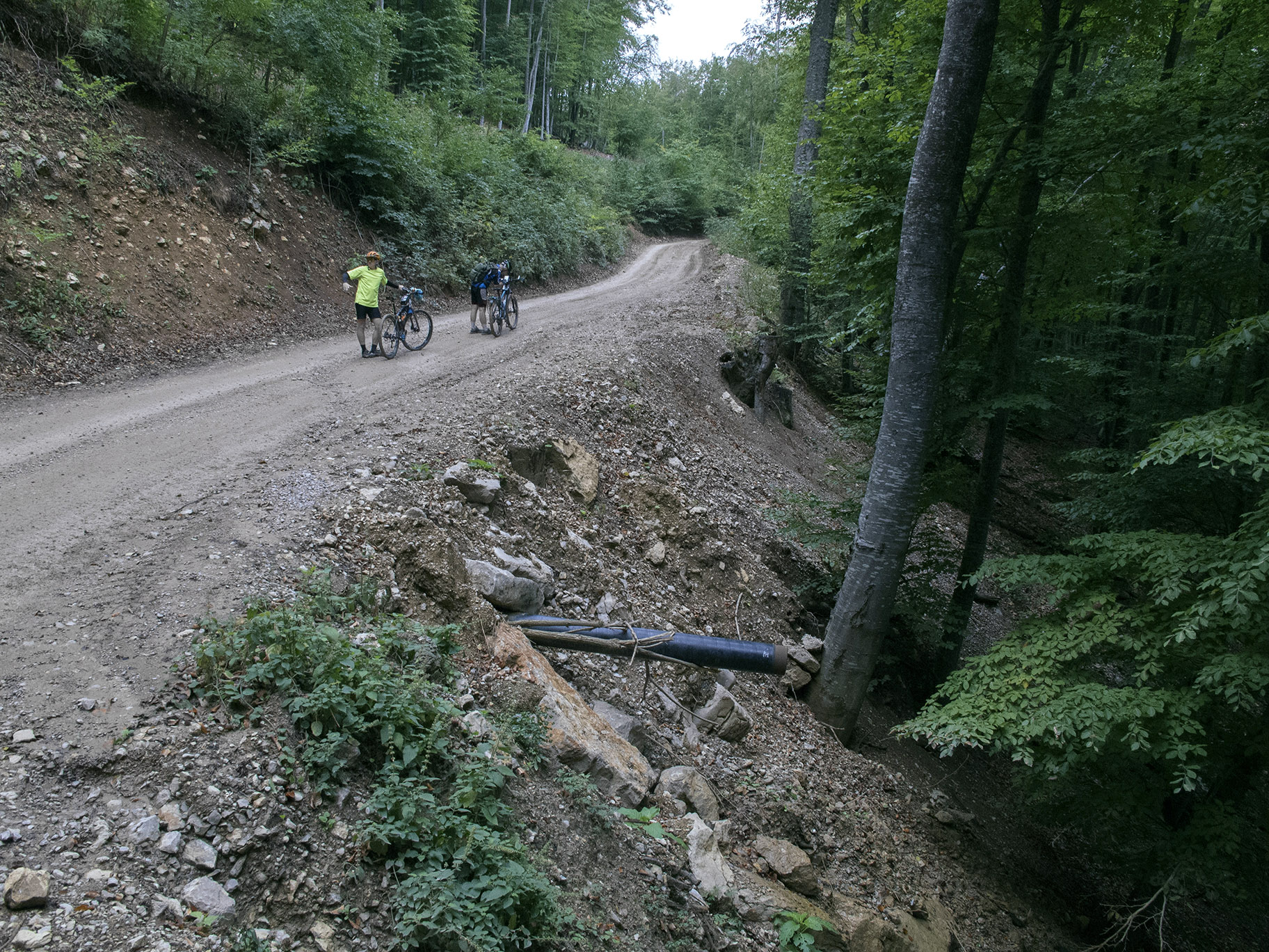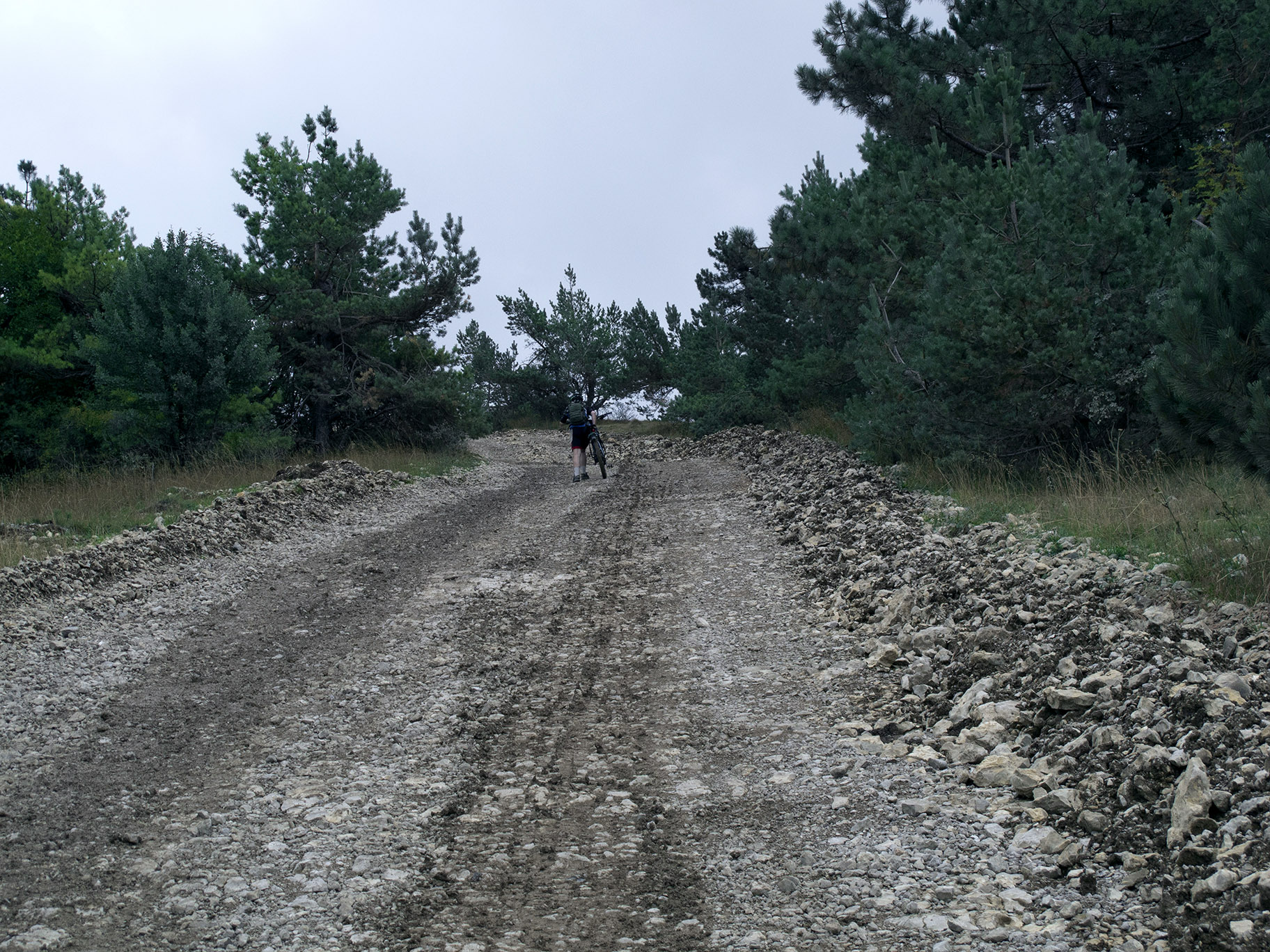 Чтобы не брать в лоб крутой начальный участок, мы сделали небольшой крюк, и, миновав шлагбаум с угрожающими надписями, начали подниматься по лесной дороге, которая тоже довольно круто поднималась по склону. Так что пришлось заниматься велотолканием. Вначале колея была довольно сырой, с лужами и грязью, потом по мере подъёма грунт сменился на камни, езда по которым даже вниз была бы невозможной ().