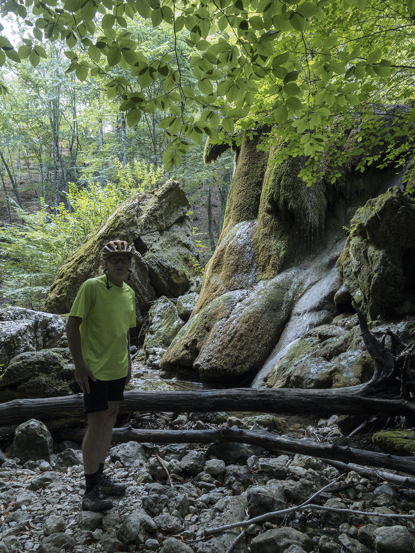 Да, подъём по такой тропе, да с гружёными велосипедами лёгким не назовёшь... Не даром другое название - «тропа грешников». Пройдя пару десятков ступеней, стало ясно, что надо подниматься разделкой: двадцать ступенек поднимается велосипед, потом назад - за рюкзаками. И так - несколько раз... На развилке троп (правая пошла к пещерам) немного отдохнули (). Следующий этап - до родника: надо было набрать воды на вечер (). Родник оборудован краником, но вода текла слабо, что дало возможность хорошо отдохнуть после тяжёлого подъёма ().