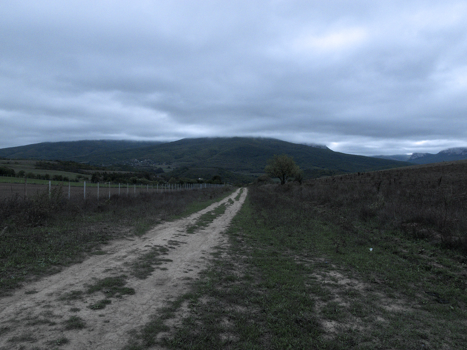Полевая дорога ведёт нас в Солнечноселье (вид назад, на массив Бойка)