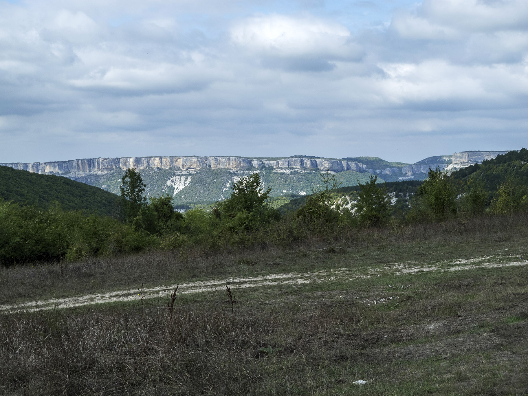 Остаток пути шли вместе, чтобы никто не отстал и не заблудился. Выйдя на большую поляну, повернули направо, и вскоре вышли на обрыв, с которого открывались шикарные виды на всю долину Качи (). А если бы гора Кыз-Куле не загораживала бы, то на горизонте при хорошей погоде было бы видно и Чатыр-Даг, и плато Бабуган (). Если присмотреться, то был виден даже храм святого Луки, который мы проезжали сегодня днём ().