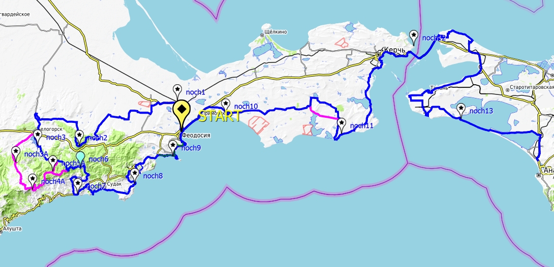 Феодосия - Владиславовка - Новопокровка - Партизаны - Золотое Поле - Курское - г.Кубалач - Пролом - г.Ак-Кая - Белогорск - Караби-яйла (или Головановка-Алексеевка) - Поворотное - перевал МаскИ - хр.Орта-Сырт - Междуречье - Морское - Веселое - Новый Свет - Судак - Прибрежное - Щебетовка - Коктебель - Орджоникидзе - Феодосия (конец первого этапа) - Приморский - Вулкановка - Марьевка - г.Опук - Яковенково - Челядиново - Керчь (конец второго этапа) - паром - Ильич - Кучугуры - Сенной - Тамань - Волна - Благовещенская - Анапа.